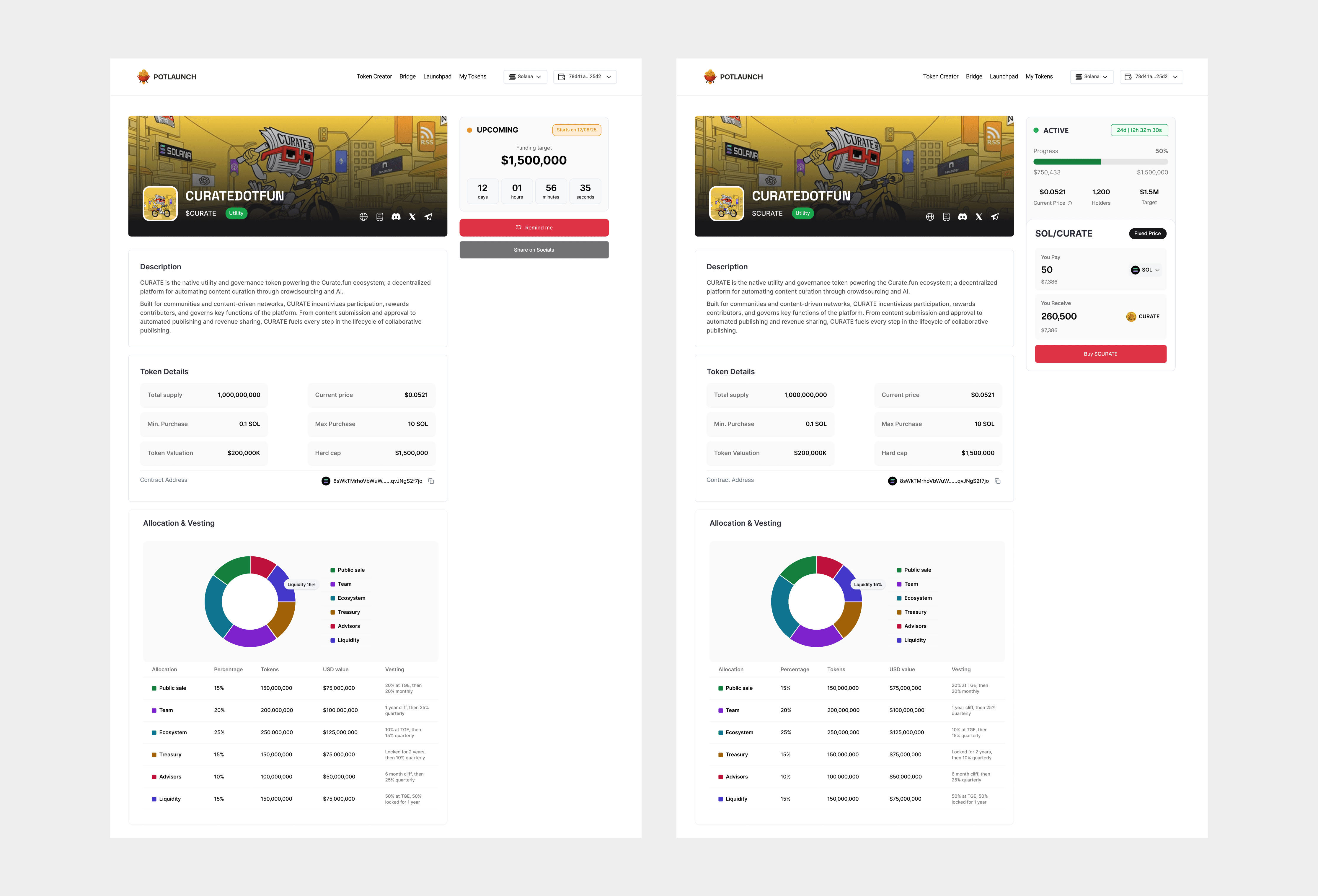 We unified all three stages: Pre-Launch, Live Launch, and Post-Launch Analytics—into a single, evolving details page. Each state updates automatically as the project progresses, visually guiding users through setup, sale, and live trading. Clear indicators, progress bars, and contextual call-to-actions help users instantly know what to do next.